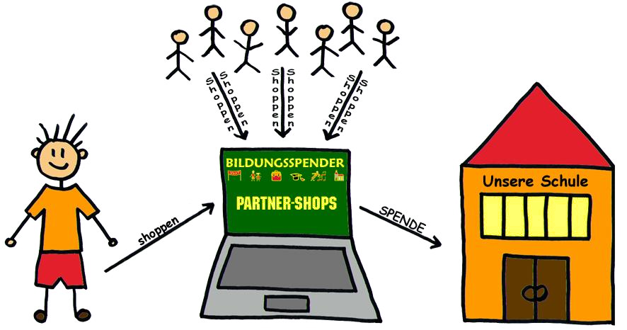 Der Bildungsspender ist eine gemeinnützige Unternehmergesellschaft, die es z.B. Schulen und Vereinen erlaubt, “Spenden-Shops” einzurichten und durch Beteiligung an den Erlösen der Partnerunternehmen des Bildungsspenders das eigene Spendenaufkommen zu erhöhen. Dabei gehen 90% der Vergütungen der Partnershops direkt an die Einrichtungen und somit in unserem Fall direkt an unsere Kinder. 10% der Vergütungen werden benötigt, um den Verwaltungsaufwand des Bildungsspenders abzudecken.